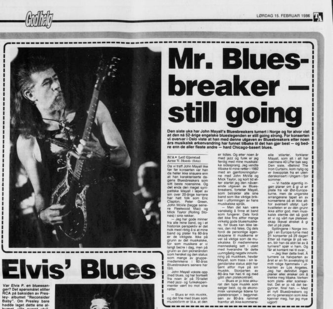 Den siste uka har John Mayall’s Bluesbreakers turnert i Norge og for alvor vist at den nå 52-årige engelske blueslegenden er still going strong. For konserten vi overvar i Oslo viste at han med denne utgaven av Bluesbreakers etter noen års musikalsk ørkenvandring har funnet tilbake til det han gjør best – og bedre enn de aller fleste andre: hard Chicago-basert blues.