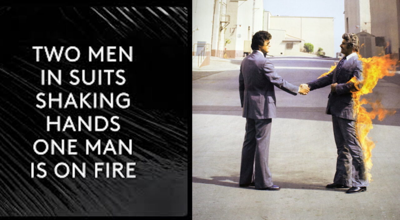 Pink Floyd-fans har hatt nok å spekulere over den siste tiden. På sosiale medier og strømmetjenester har Pink Floyd fjernet coverne på sine album og erstattet dem med tekst på sort bakgrunn som beskriver coveret med ord. Dermed blir «Wish You Were Here» presentert med teksten «Two men in suits shaking hands. One man is on fire».